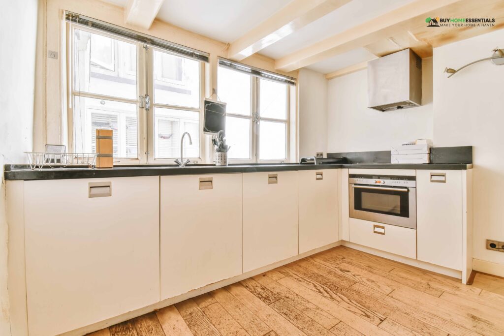 Combining classic white cabinets with black granite countertops creates an elegant kitchen aesthetic. White cabinets contrast beautifully with the deep richness of black granite, striking a perfect balance. The sharp contrast adds visual interest as well as enhances the atmosphere.