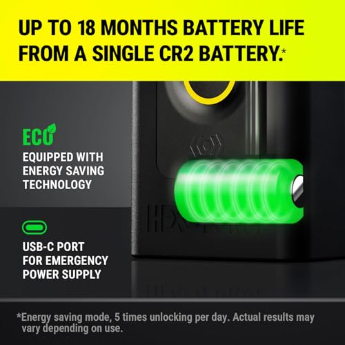 ENERGY SAVING FOR LONG BATTERY LIFE – Advanced energy-saving technology that maximizes battery efficiency for long-term use, ensuring reliable operation with minimal power consumption. Powered by a single CR2 battery, the lock lasts up to 18 months (energy saving mode, 5 times unlock per day). Built-in USB-C emergency power port allows quick backup power from a power bank.